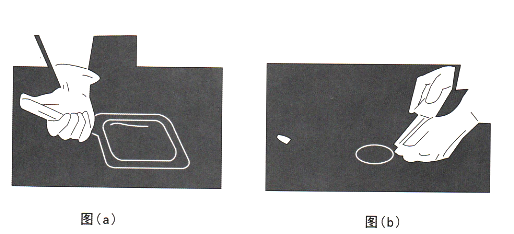 (1)根據(jù)蓋膠破損狀態(tài)可作圓形或菱形修補(bǔ),沿破損輪廓四周至少15到20毫米,劃 出切割修補(bǔ)線,如圖a,b,以45度角斜切并剝?nèi)ヒ褤p壞的蓋膠,切割時(shí)注意不要損壞 下面的布層。